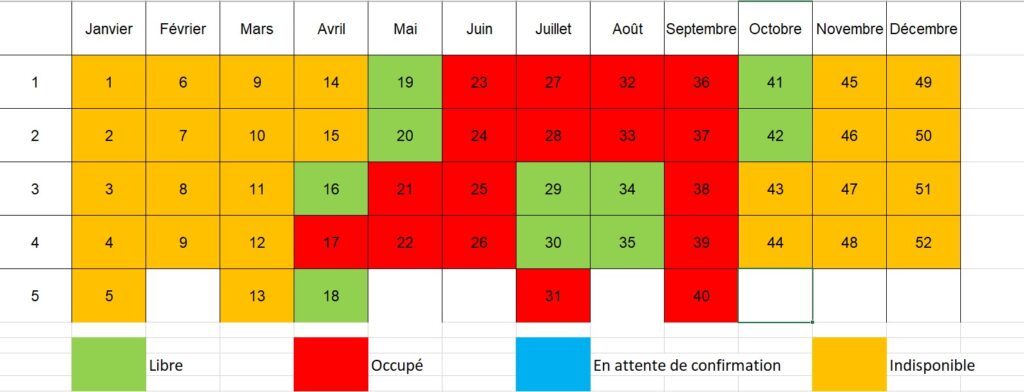 Les numéros sont ceux des semaines. Nous louons du samedi au samedi, avec quelques aménagements parfois, mais toujours par semaine. Nous ne louons pas pour les week-ends ou pour moins de 7 jours.